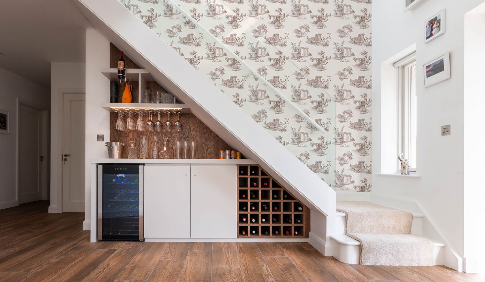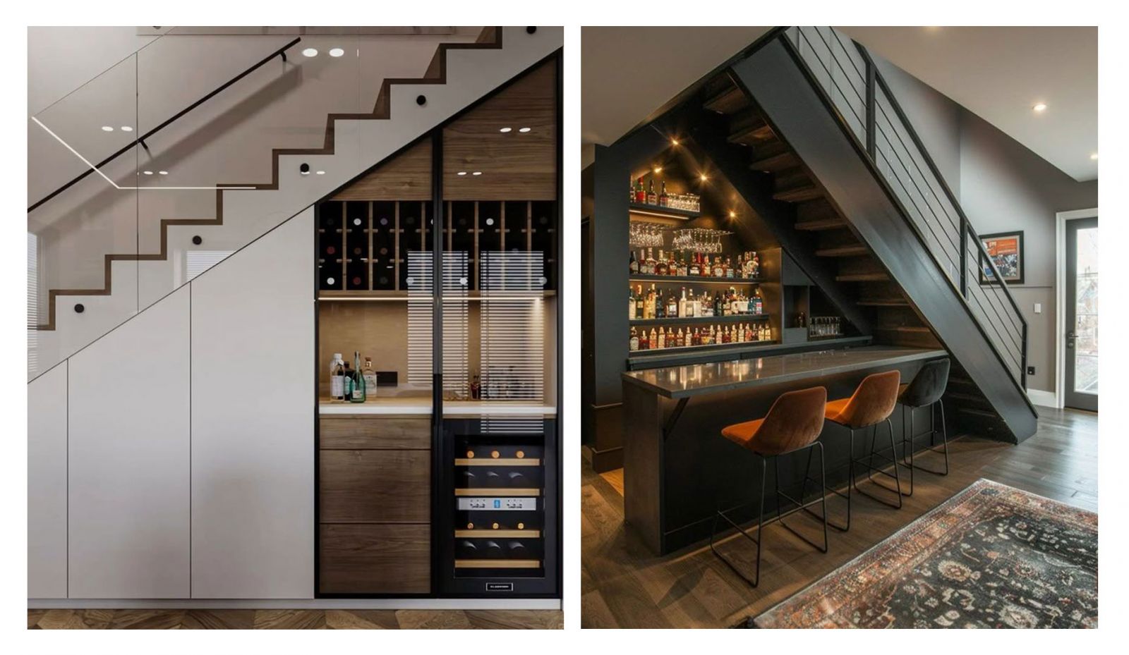 Этот вариант для ценителей благородных напитков, для тех, кто любит угощать гостей резервным бордо и мадерой. Стильные полки для бутылок, держатели для бокалов и приглушенное освещение превратят лестничную винотеку в место для приятных встреч.