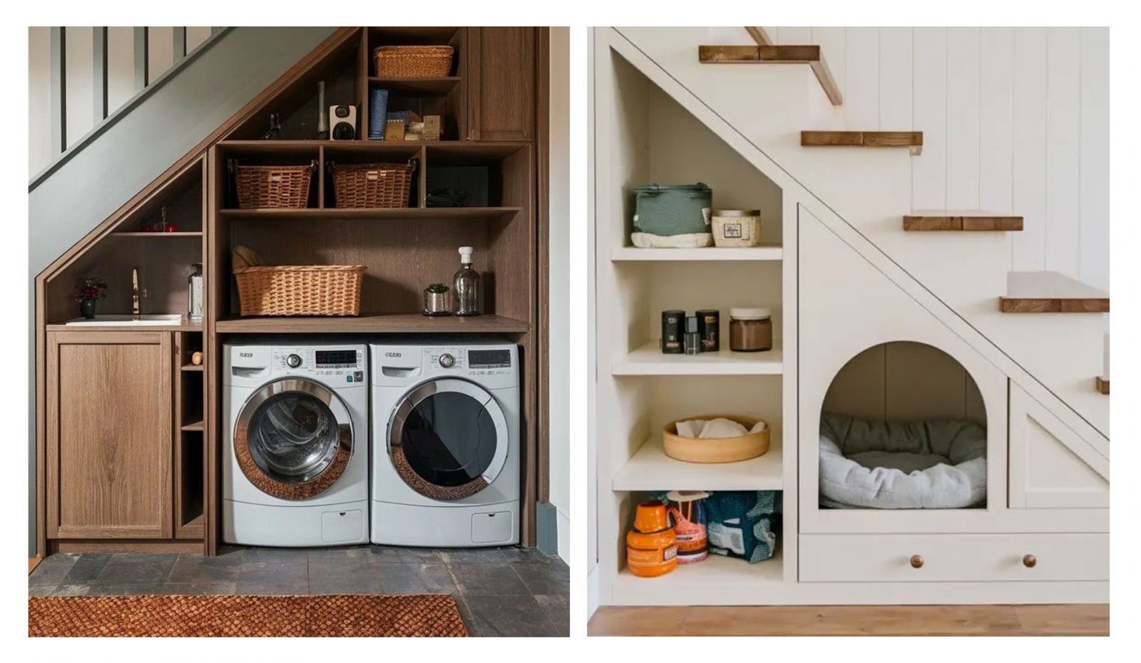 Разумеется, это далеко не все возможные варианты «освоения» подлестничного пространства в доме. При наличии фантазии и умелых рук там можно оборудовать уголок для питомца, мини-прачечную, спальное место или домашний кинотеатр. Так что, если у вас есть лестница, считайте, что вам повезло!
