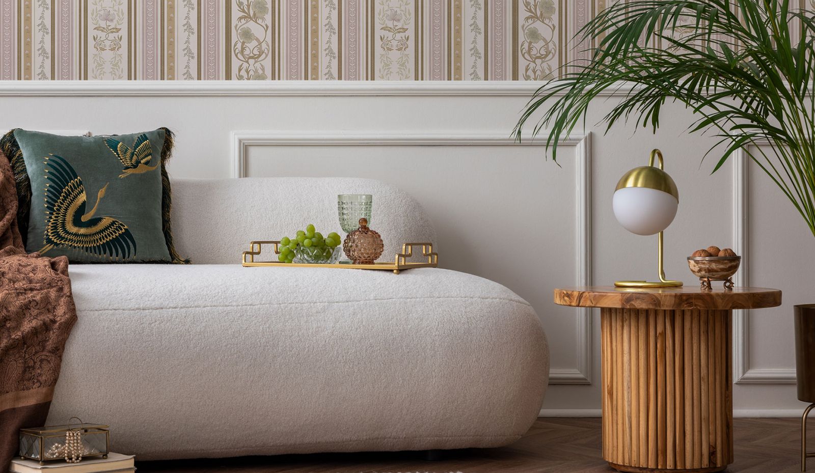 Немного природы ещё никогда и никому не навредило. Так и в интерьере. Роскошь и пафос стиля ар-деко можно сочетать с природными элементами стиля эко. Используйте в отделке натуральное дерево, камень, растительные принты. Повесьте на стену резное металлическое панно или необычной формы зеркала